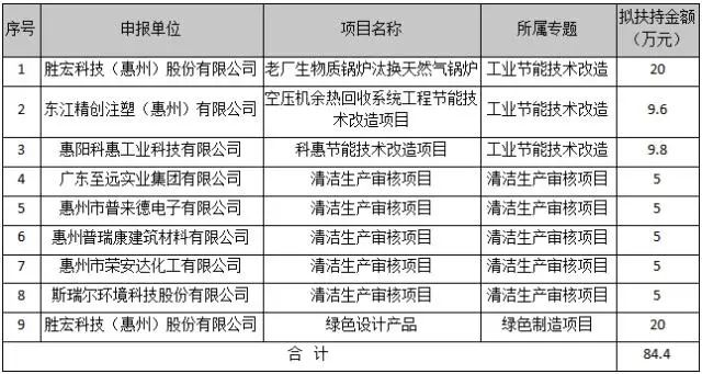 据公示附件“2021年惠阳区节能专项资金项目拟安排表”内容,获得嘉奖的项目共有三个专题类别,分别为:工业节能技术改造、清洁生产审核项目和绿色制造项目,分别有3项目、5项目和1项目。其中星空科技(惠州)股份有限公司的老厂生物质锅炉汰换天然气锅炉,东江精创注塑(惠州)有限公司的空压机余热回收系统工程节能技术改造项目等3项目为工业节能技术改造;星空科技(惠州)股份有限公司的绿色设计产品为绿色制造项目;惠州普瑞康建筑材料有限公司、广东至远实业集团有限公司等5企业的清洁生产审核项目为清洁生产审核项目。