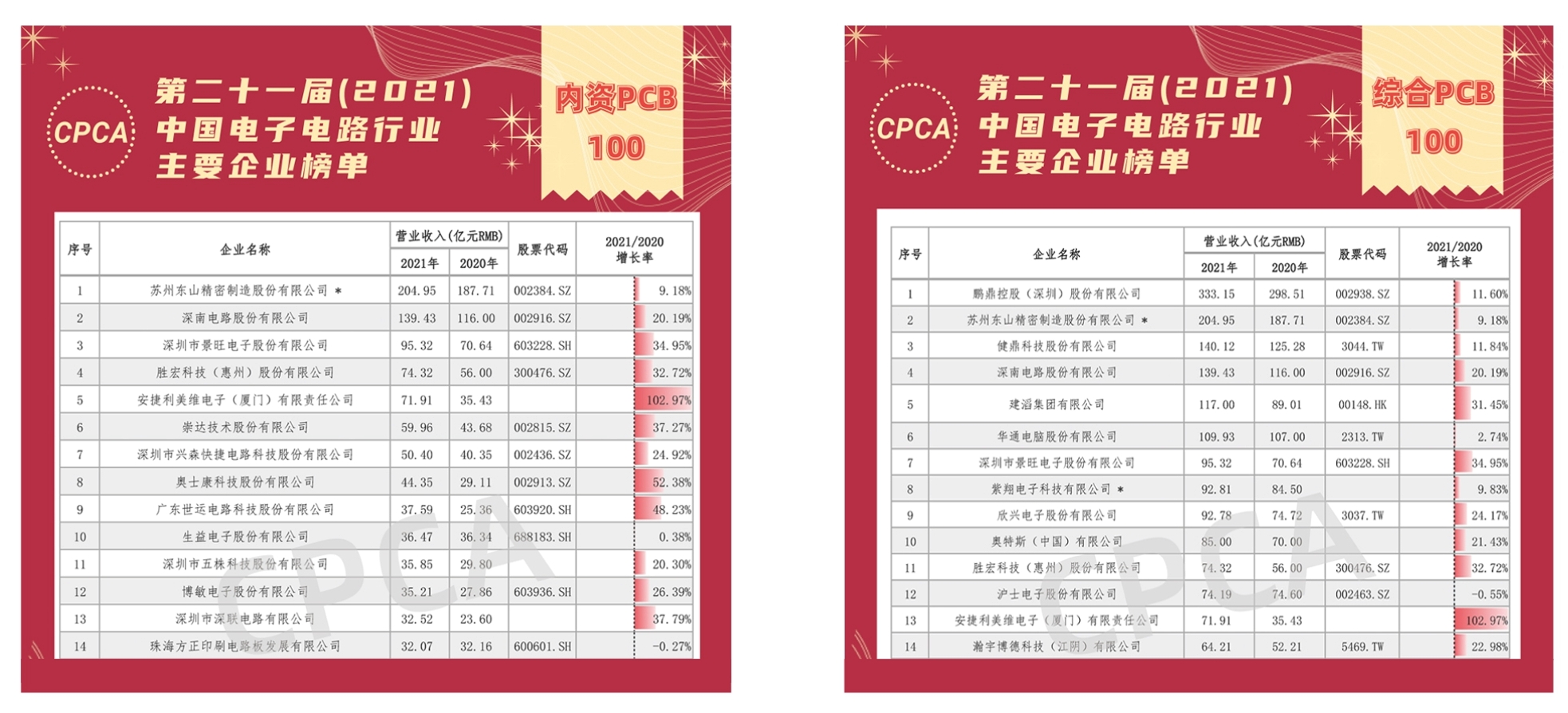 5月18日,由中国电子信息行业联合会和中国电子电路行业协会联合发布的第二十一届(2021)中国电子电路行业主要企业榜单正式发布。榜单中设有综合PCB百强企业排行、内资PCB百强企业排行、覆铜箔板企业排行等10个子榜单,共计有241家企业上榜。其中星空科技以74.32亿元的营收位居中国综合PCB榜单第11名,内资第4名。